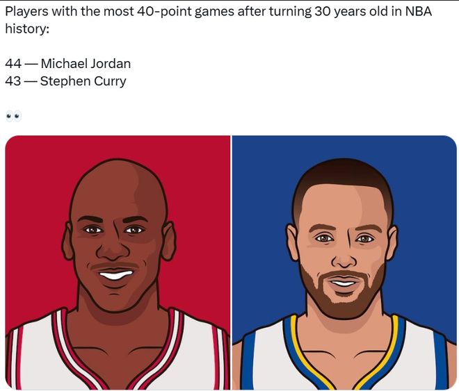 第五,这是库里30岁后第43次砍下40+,NBA历史第二多,仅次于乔丹(44次)。